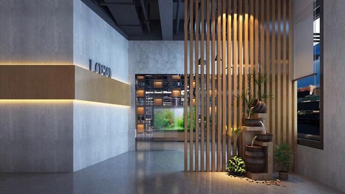 前臺空間的設計,設計師在設計的時候,省略了前臺的設計,設計師認為在這樣的空間中,設置前臺對于空間來說是一種負擔,最后設計師以泉水流淌不息的藝術作品,來表現企業生生不息的企業屬性。