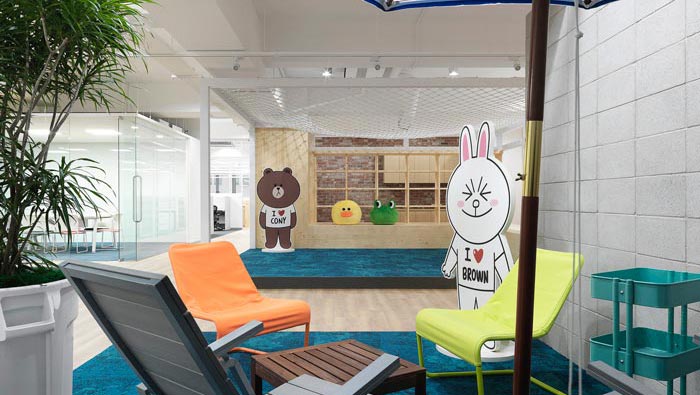 度假區域的設計:此處的設計有一點類似度假海灘的感覺,這樣正是設計師設計的目的,設計師希望讓員工在辦公空間之中可以享受到各種新穎、舒適的自然環境,在此處仿佛置身于海邊,藍藍的海水、輕柔的風襲來,讓人不自覺的感到愜意。