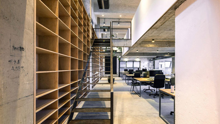 loft風格辦公室樓梯區設計:設計師為了避免樓梯對整個空間帶來影響,故此在設計的時候選用木材樓梯,這樣既可以節約成本,又可以最大層度的釋放空間的面積。