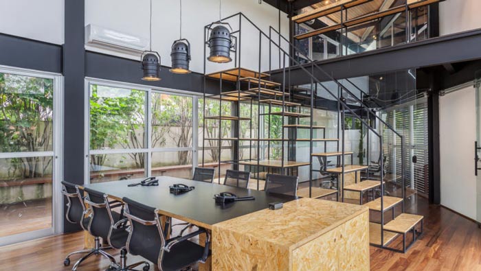 loft風(fēng)格辦公室會議室設(shè)計:設(shè)計師將會議室安置在此處,是因為此處的采光極好,對于會議的開展十分有好處,同時此處也位于室內(nèi)與室內(nèi)的交界處,室外的景色也在不時的影響室內(nèi)。