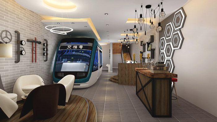 二樓的設計,與一樓一般無二,不同的是站臺區域被換置成辦公室區域,在動車的頭部增加洽談區域、休息區域,在設計師看來不管是什么企業,想要發展必須依賴人才,但是如何挽留人才就需要企業化大功夫了,設計師希望這樣的空間可以為企業留下發展必備的人才。