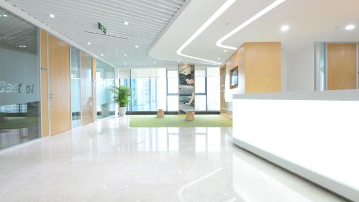 前臺的設計:設計師在實地考察的時候,特別重視挖掘每一個空間的優(yōu)勢,此處面朝南采光極好,在設計師看來一個明亮的前臺,對于企業(yè)來說也是一個好的象征,陽光通過不斷的折射化為柔光透過窗戶射入室內,剛好與地面的綠植地毯映襯在一起,瞬間改變了空間的特性,讓空間自然、大氣、敞亮。