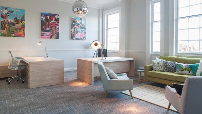 接待區域的設計:此處位于前臺與樓梯的過渡空間之中,客戶經過前臺在此處休息和洽談,起到空間與空間的過渡作用,同時讓客戶對整個空間有一個大致了解,不會覺得突兀,接待處對客戶的信息進行記錄之后,與二樓進行對接,也保證了工作的效率得以提升。