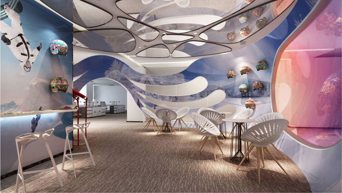 接待區域的設計,設計師在設計的時候,對整體進行了凸透設計,一則使空間創意無限,二則將企業商品融入空間中,以此得以展現。