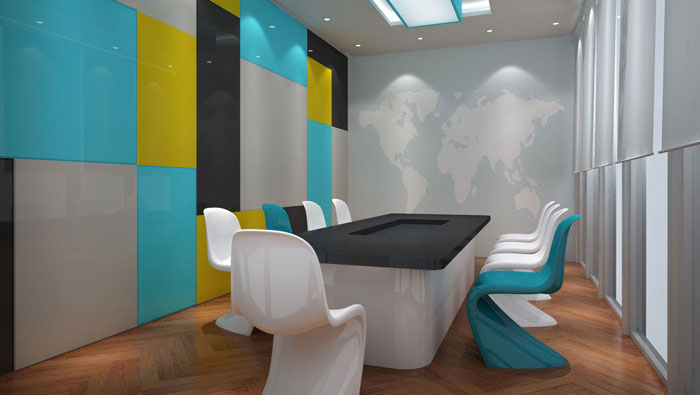 會議室的設計,設計師在設計的時候,空間采用白色、藍色、黑色、黃色相結合的方式對空間進行設計,一則色彩之間的融合使空間創意無限,二則為企業打造優質的會議環境。