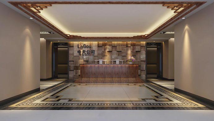 前臺區域的設計:在設計中設計師將電梯間與過道完美的利用起來,因為此處是一個T字型的動線,故此設計師將logo與logo背景墻安置在電梯間對立面的墻壁上,同時將前臺也安置在此處,通過設計的搭配此處儼然已經煥然一新,這樣的設計既保留了動線的屬性也增加了展示與接待的屬性。