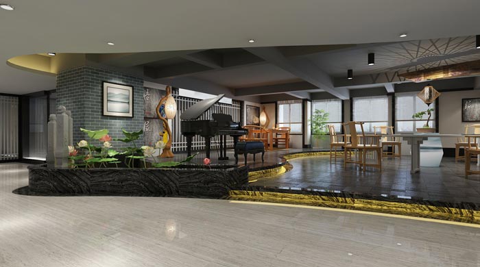 走廊的設計:此次是從前臺進入室內的過渡區域,設計師在設計中除了保證動線的暢通之外,在其中加入了花草和綠植,目的就是希望為空間帶來自然的氣息,中式本身就與自然想合,在加上自然的寵兒(花草)、禪意的佛像,希望在客戶的心中留下一絲漣漪。