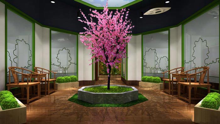 過道的設計:此處有綠植、花草、木制柵欄可謂十分齊全,其中最引人關注的是那一顆含花待放的桃花,看到那花蕾媽紅小巧的桃花,給人的是一種觸動,不由自主的融入那花愫中,去感受桃花的生命,另外桃花粵語中“宏圖”與“紅桃”同音,桃花寓意“大展宏圖”。