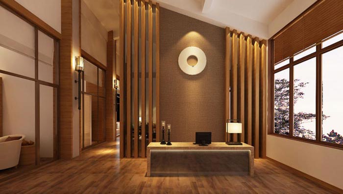 前臺(tái)的設(shè)計(jì):空間本身是一個(gè)下沿式的空間,設(shè)計(jì)師在思索許久之后,覺得首先是要消除空間下沿的缺憾,在此基礎(chǔ)上設(shè)計(jì)師以隔斷自然向上的布局,來沖淡空間的下沿格局,化不利為有利,在過道處采用一個(gè)超過90度的角度來完成空間的節(jié)點(diǎn),這樣既化解了下沿式的格局,也塑造了大氣、溫馨的空間格局。