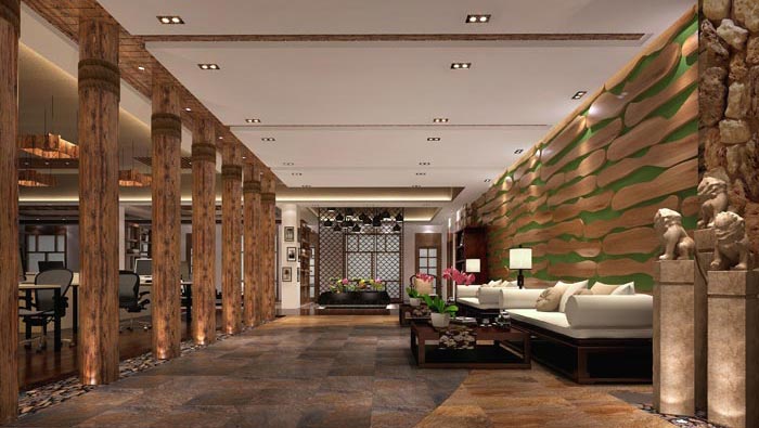 接待區域的設計:此處是一個中式現代家具的集合區,中式現代家具以其優美的線條、多變的曲線、靈秀的圖案、點到為止的制作技藝,加上符合現代人需求的時尚元素和個性化,令審美視線不斷跳躍,古樸和時尚融為一體,此處即為接人待客,又展現企業為人處世的內涵。