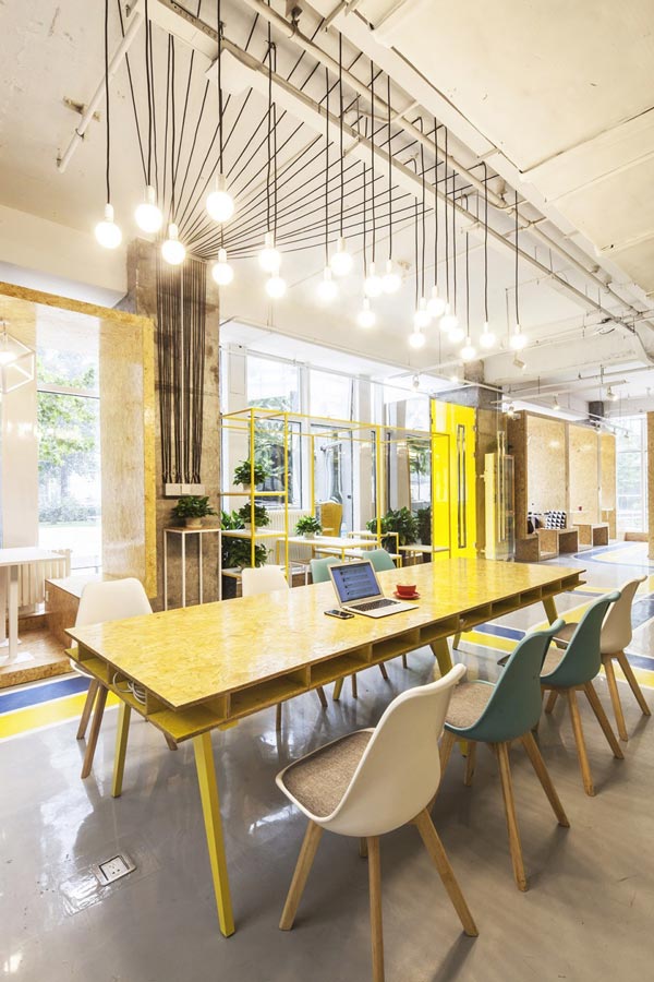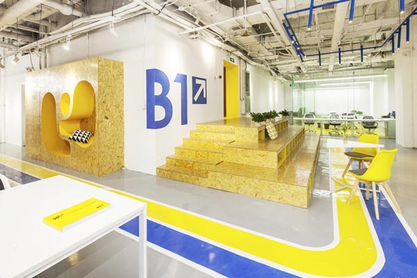 交流區域的設計:設計師在設計的時候,大膽的采用黃色、白色、藍色三色結合的元素設計,白色是百搭色、黃色與所有色彩有很強的親和力、藍色是天空的顏色,空中包含著白色與黃色,顯示出企業包容的內涵。