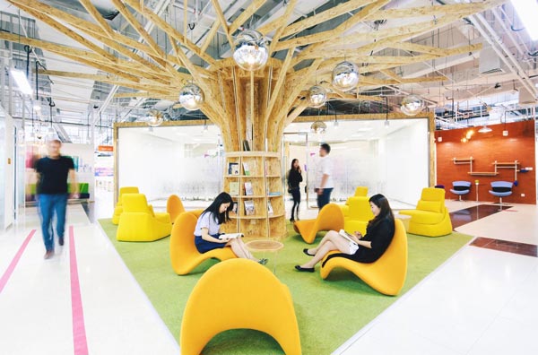 閱讀區域的設計:設計師在設計的時候,在中心安置了一個樹狀模型,此模型本身是樹的形狀,為空間帶來了自然的屬性,其中分不了收納空間,周圍分不了休息場所,讓員工在此處學習、休息、歸零。