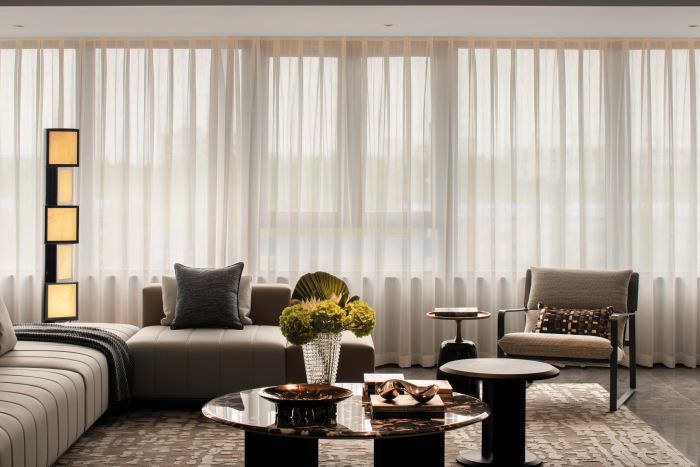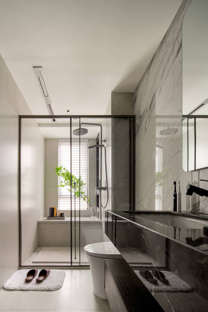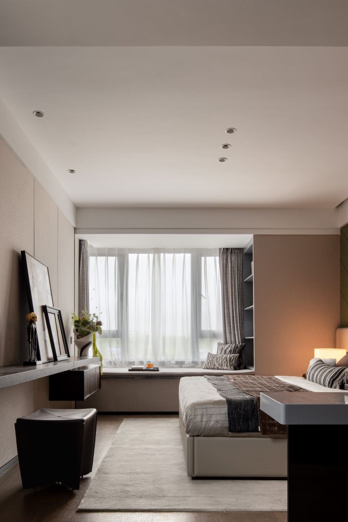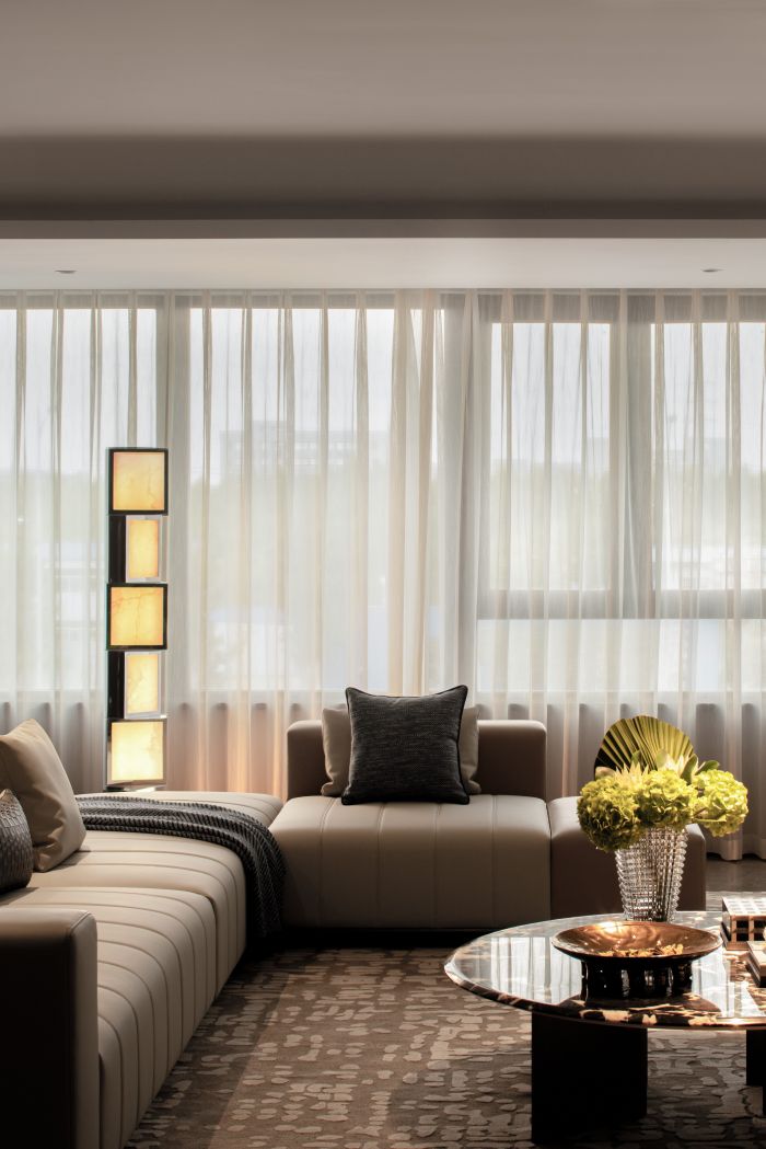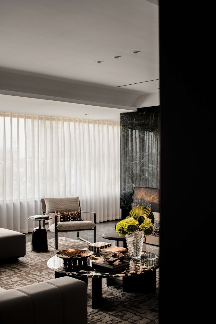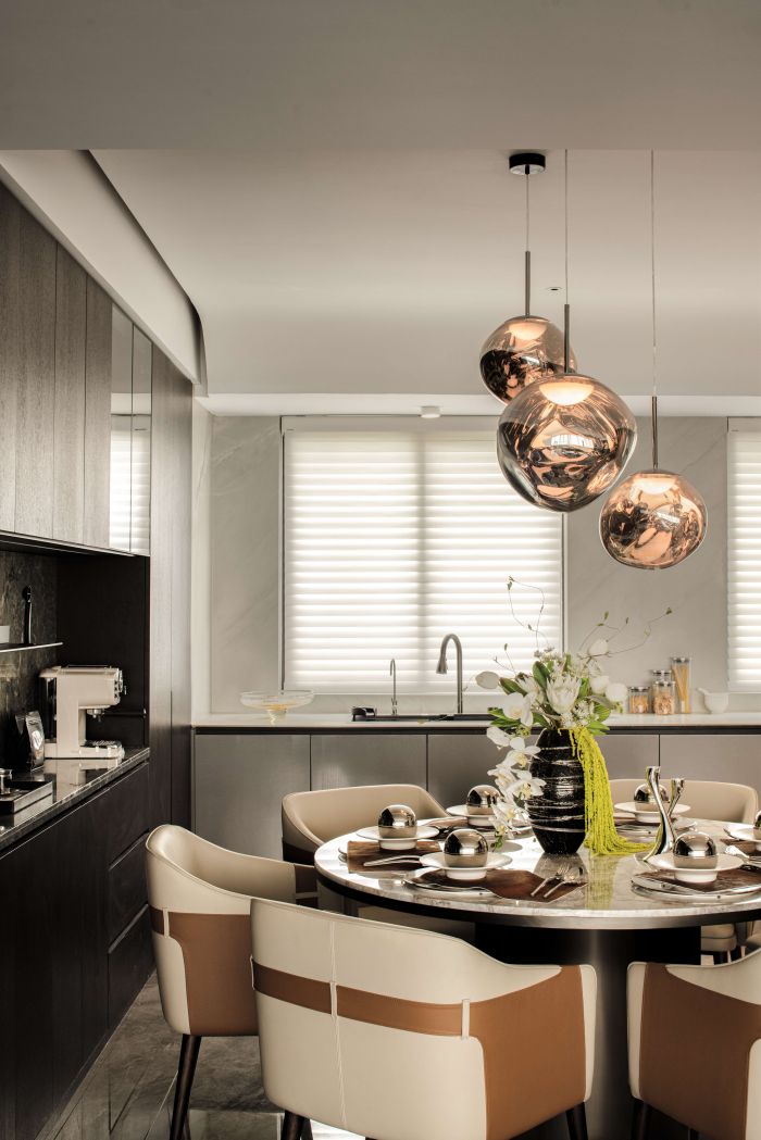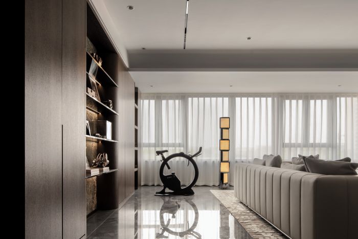 客餐廳整體風格現(xiàn)代輕奢,設計語言采用直線條為主,塊面的分割,給人以簡潔大方的感受。客廳空間整體方正且視野開闊,劃分為會客廳及有氧多功能區(qū)一體,自由且舒適,餐廳區(qū)域為開放式餐廳,中餐及西式操作臺結合,實現(xiàn)不同的功能需求。地面材質公共區(qū)域大面積采用深灰色網(wǎng)紋石材鋪貼,大氣穩(wěn)重。