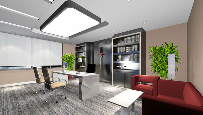 總經(jīng)理辦公室的設(shè)計(jì),白色的辦公區(qū)域給人的感覺就是簡潔、明快,富有現(xiàn)代感,深紅色的接待區(qū)域?yàn)榭臻g帶來穩(wěn)重、成熟的空間屬性,綠植的設(shè)計(jì)為一方面為空間增加活力,另一方面為空間增加一絲涼意。