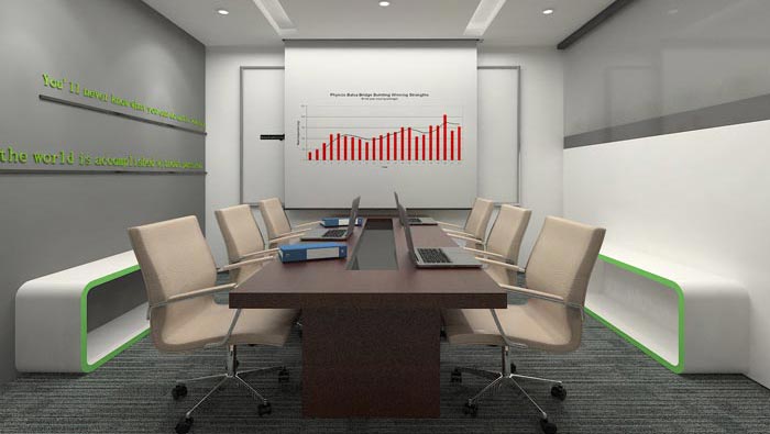 會議室的設計,設計師在設計的時候,將會議桌安置在中心區(qū)域,這樣在保證基本的需求之外,還可以使動線分布在兩端加大空間的活動空間,同時在不影響空間功能的前提下,設計師利用軟裝來增加空間的承載能力。