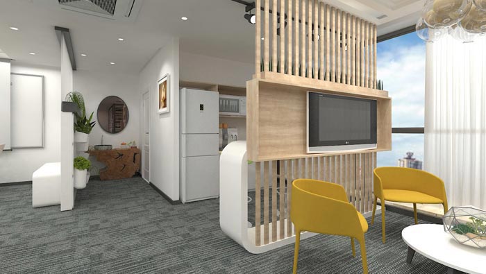 進門區(qū)域的設計,設計師在設計的時候,將進門空間以6:4的比例將空間劃分開來,4為進門區(qū)域、6為接待區(qū)域,設計師希望以過渡將企業(yè)品牌設計在隔斷墻上,讓客戶可以對企業(yè)有一個初步的認知。