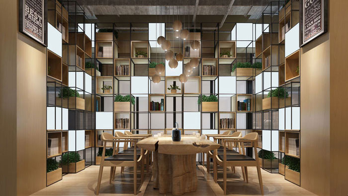 休閑區域的設計,設計師以原木框架做為支柱,以軟裝、綠植做為搭配,將咖啡廳的設計原則引入其中,這樣的空間更能承擔起休閑的作用。