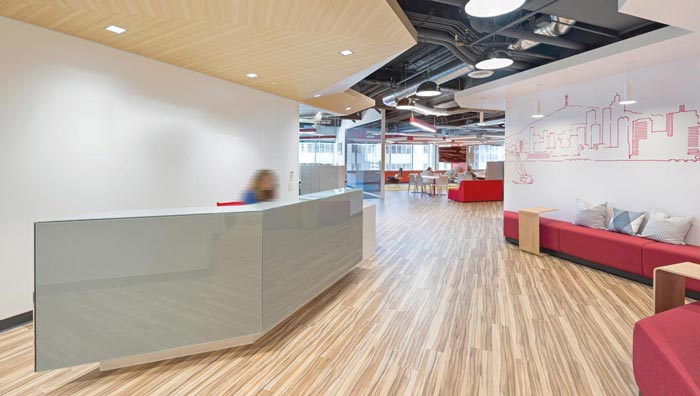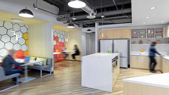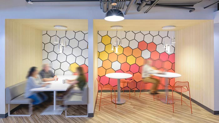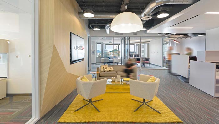 辦公區域的設計:設計師在設計的時候,著重考慮了開放式與封閉式的優點與缺點,在考慮再三之后設計師中和了相互之間的優點,以開放式為一個大的框架、在其中包含封閉式的設計,讓開放與封閉之間形成一個很好的互動,讓開放包含封閉、讓封閉互補開放。