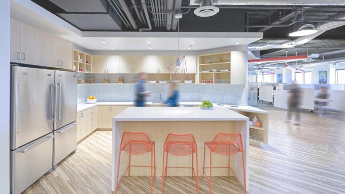 茶水間的設計:設計師在設計的時候,將吧臺也融入其中,在設計師看來茶水間是企業的一個休閑場所,設計師希望在此處員工可以脫離現實的壓力、工作的壓力,在此處可以相互交流、彼此攀談,在此處可以忘卻壓力,可以在此處重新歸零。