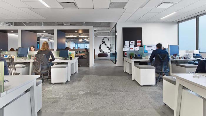 辦公區(qū)域的設計:設計師設計此地是在劃分動線之后,設計師將動線自然向內(nèi)將空間分為兩半,這樣做即可以保證空間的通暢性,同時辦公區(qū)域的格局自然形成,設計師采用開放式的設計手法將辦公桌安置在空間中,在滿足辦公需求的同時設計師也重點強調(diào)人性化的設計。