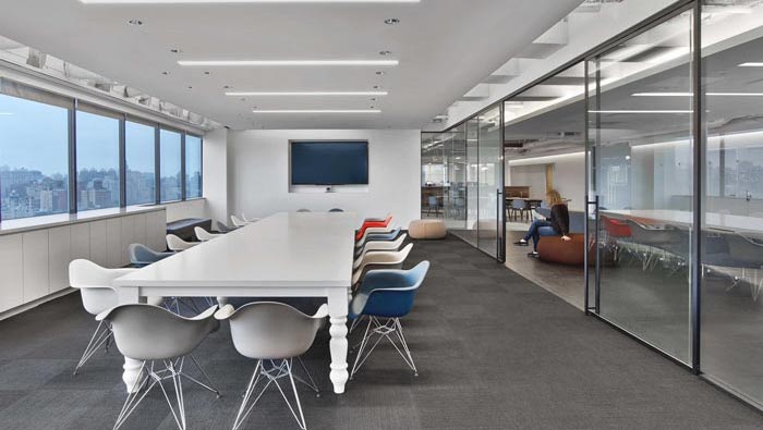 會議室的設計:設計師將其安置在空間的一個獨立空間之中,此處與外部采用玻璃隔斷進行分離,以此保證采光的完整性,同時窗簾的設置也可以保證會議室的私密性,在開展會議的時候可以將外部窗簾拉上,就可以形成一個獨立的空間,空間中沒有一點雜質(zhì),有的只是簡單,讓人的思想在空間中相互交匯。