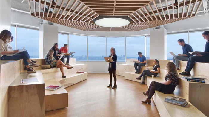 匯報區(qū)域的設計:此處是一個環(huán)形空間,這樣的空間是一個天然的匯報區(qū)域,因為空間的兩邊可以設置成類似足球場看臺的層疊式座椅,這樣可以增加空間的容納能力,同時類似三角的設計自然的向內(nèi)聚集有利于匯報,同時中間區(qū)域被設計師空置出來,可以留給匯報人,讓匯報更充滿新意。