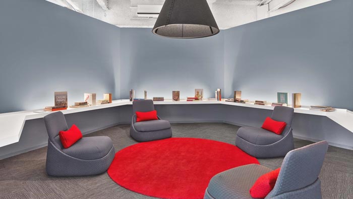 過道的設計:此處位于辦公區(qū)域的前方,相當于是一個過渡區(qū)域,但是設計師不忍心將此地浪費,故此將此地開發(fā)成學習區(qū)域,此地差不多在空間的中心位置上,向前向后都十分方便,而且此處剛好向陽,讓學習的員工能在學習的過程中,感受到生活的美好。