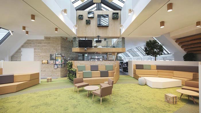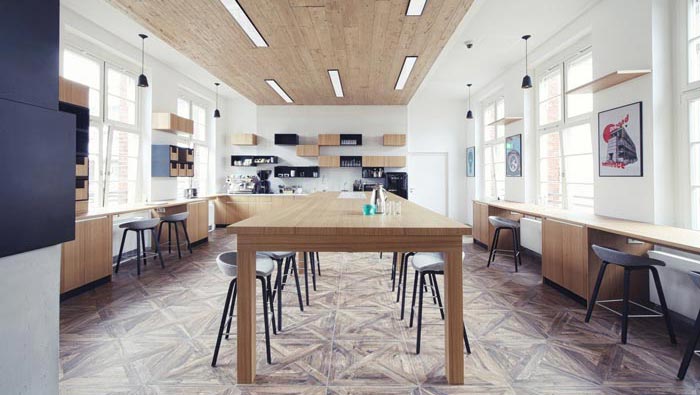 辦公區域的設計:設計師重點在于彌補空間結構對人的影響,因為空間本身是不規則的,這樣很可能讓員工感受到不適,故此設計師在空間的兩邊采用開放式,因為窗呈上下布局這樣很好的將采光加以折射后射入室內,讓光更加溫和、更加溫暖,空間中心采用造型設計為特定部門打造單間式空間,既滿足了企業的需求,又將大空間分為一個個的小空間,讓空間相互彌補、相互搭配。