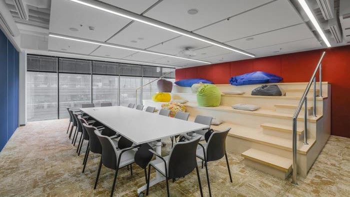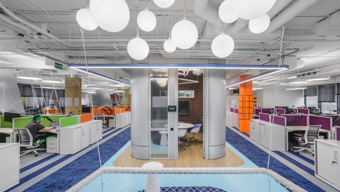 辦公區域的設計:設計師在設計的時候,將辦公區安置在空間的兩側,中間部分主要以洽談、休息為主,同時在辦公區域設置的同時,利用色彩的轉變來區分部門的位置,每一個部門之間都有一定的緩沖地帶,這樣做的目的就是希望在開放的空間內保留員工的私人空間。