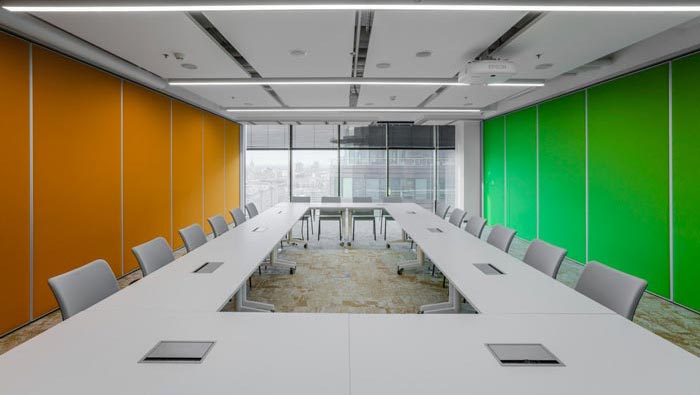 會議室的設計:設計師在設計中的構想就是打造一個大氣的空間,這是設計師的堅持,因為在設計師看來會議是解決,企業發展中遇到的問題與難題,故此大局觀的養成十分重要,因為只有大局觀的人才知道如何取舍,故此空間的設計圍繞著養成大局觀的思路展開,正所謂字如人、設計師也希望空間如人。
