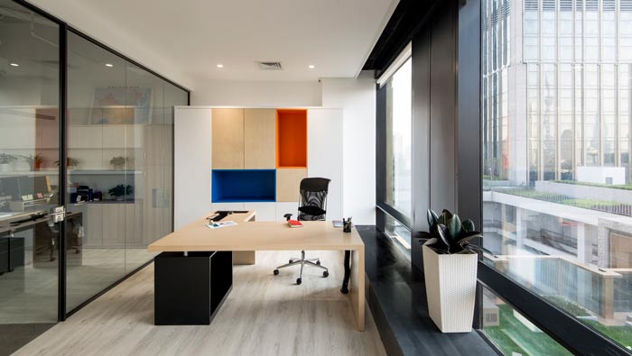 旅游公司總經(jīng)理辦公室設計:總經(jīng)理辦公室位于空間的一側,在與總經(jīng)理交流的時候,設計師了解到總經(jīng)理本人喜歡簡單一點,此地采光、風景、位置俱佳,即滿足辦公的需求,同時也滿足休閑的需求。