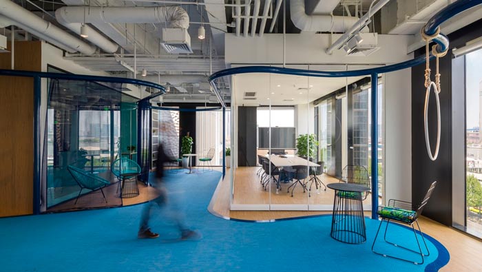 旅游公司辦公室活動隔斷設計:設計師在辦公室設計的時候,幾乎所有的隔斷都是可以移動的,也就是說需要的時候隨時可以組成一個空間,但是在不需要的時候,玻璃隔斷也會打開,將所有空間連接起來。
