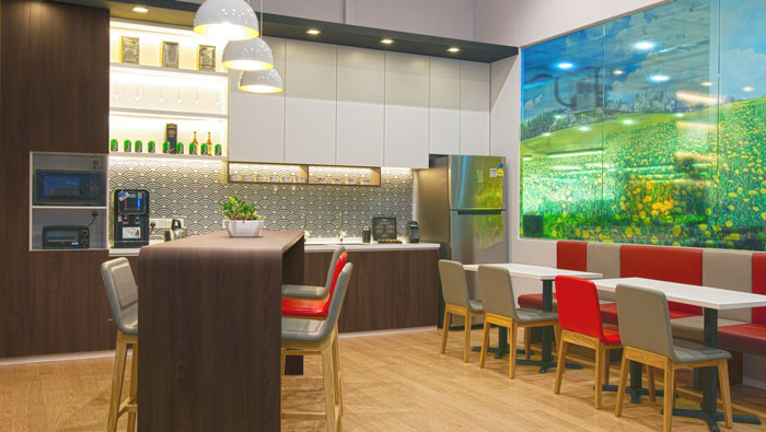 ? 茶水間的設(shè)計:設(shè)計師在設(shè)計的時候,將其安置在一個獨立的空間之中,這樣設(shè)計的目的就是為了與外界隔絕,設(shè)計師希望讓員工在此處不會受到外界工作壓力的影響,設(shè)計師希望讓員工在此處相互之間交流與工作無關(guān)的話題,讓緊張的腦細胞得到緩解,設(shè)計師認為辦公也需要一張一弛,這樣對于員工的創(chuàng)造性有很大的促進作用。