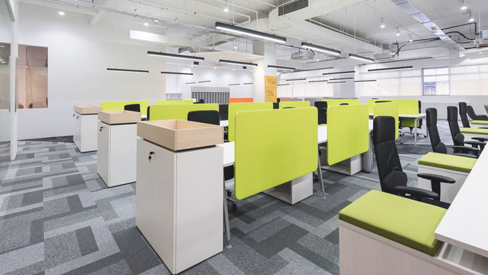 ? 辦公區(qū)域的設(shè)計:設(shè)計師在設(shè)計的時候,在整體上依然采用了開放式的設(shè)計手法,只是在細節(jié)上做了一點小小的調(diào)整,就是在辦公桌的后方加上了可上可下的擋板,這樣的設(shè)計有效的規(guī)避了開放式空間的缺點,在滿足辦公區(qū)域開放的同時也為其打造私人的辦公區(qū)域,為每一個人預(yù)留了個人空間。