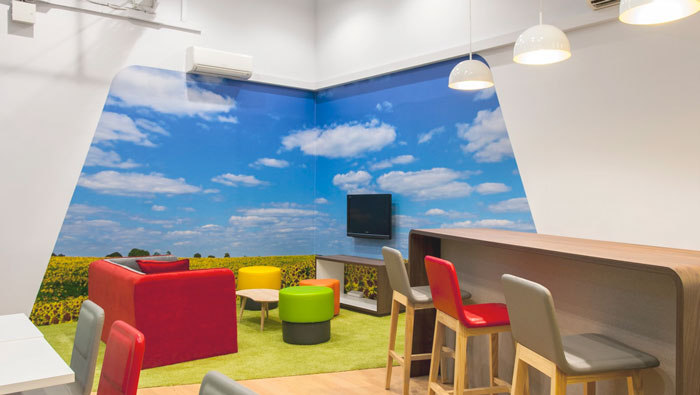 ? 休息區(qū)域的設(shè)計:設(shè)計師在設(shè)計的時候,將其安置在空間的一個角落區(qū)域,設(shè)計師希望在室內(nèi)為員工打造一片凈土,在此地沒有壓力、沒有束縛,設(shè)計師為了達到這個目的,故此在設(shè)計中采用墻紙的具象使的外景得以在室內(nèi)重現(xiàn)。