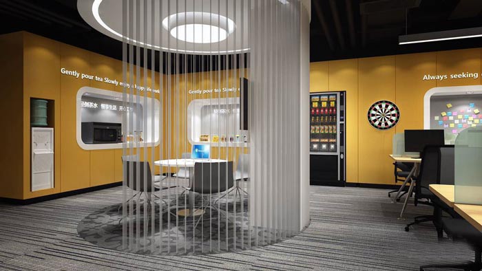紡織公司辦公室休息區(qū)設(shè)計(jì):此處設(shè)計(jì)師借鑒了咖啡廳的設(shè)計(jì)模式,在此處員工、客戶均可以在這里休息、洽談,設(shè)計(jì)師希望為企業(yè)打造一處休息之地,讓員工可以在快速的社會(huì)發(fā)展中,可以慢下來。