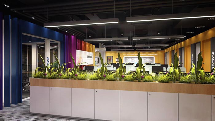 紡織公司辦公室綠植設(shè)計(jì):綠植被設(shè)計(jì)師安置在儲(chǔ)藏柜的上方,這樣可以最大程度的減少對(duì)空間的浪費(fèi),此處由儲(chǔ)藏柜+綠植組成,下方為儲(chǔ)藏柜上方為綠植栽種區(qū),兩者之間被設(shè)計(jì)師完美的融合在一起。
