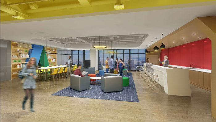 茶水間的設計,設計師沒有設計固定的場所,這樣可以使各部門的溝通與聯系,可以有效地得以提升同事之間的凝聚力、向心力,仿佛重新回自由純真,不受拘束的時代。