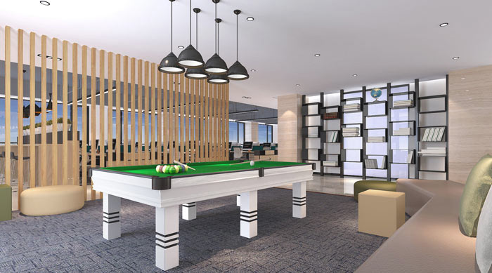接待區(qū)域、娛樂(lè)區(qū)域的設(shè)計(jì):設(shè)計(jì)師在設(shè)計(jì)的時(shí)候,與業(yè)主在此處進(jìn)行了詳細(xì)的交流,在設(shè)計(jì)師與業(yè)主看來(lái)此處應(yīng)該打破常規(guī),讓客戶把等待變成有趣的等待,故此將書(shū)架與臺(tái)球桌安置在此處,讓客戶在等待中可以度過(guò)一個(gè)不一樣的時(shí)光。