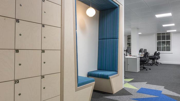 動線的設計:設計師在設計的時候,希望將動線加以利用與開發,故此在設計中在動線區域加入了休息區域與儲藏柜,休息區域即可以做為休息之用,同時也可以做為交流區域,儲藏柜的設計主要是為了讓員工有一個可以儲藏的空間,可以存放自己的私人物品。