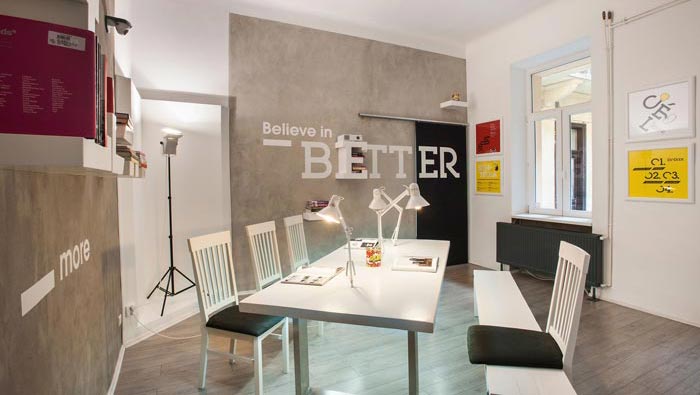 設計師辦公區域的設計:設計師在設計的時候,將其安置在空間的核心處,設計師做為室內設計師,可以更加深切的了解同為設計師的廣告設計師,在設計師中設計師也產生共鳴,認為一個寧靜、輕松、不規則的空間是必須的,這樣的空間可以為設計師的設計提供更多可能,同時在設計的時候設計師也保證了各個空間之間的相互連接。