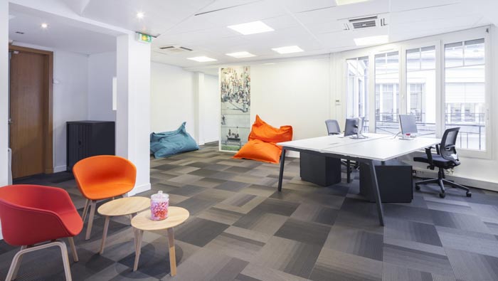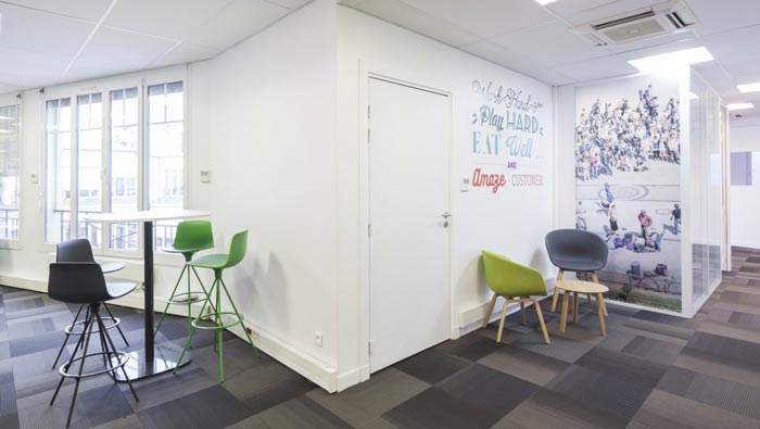 空氣環保公司辦公室洽談區設計:空間內存有拐角與未開發區域,設計師的目的就是希望將其合理的加以開發,軟裝無疑是最好的選擇,設計師希望洽談可以無處不在。