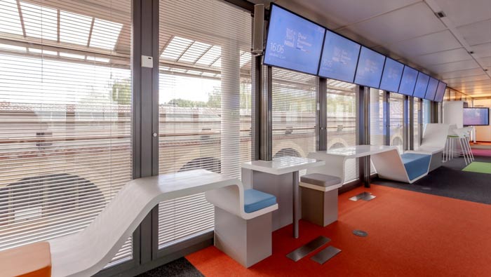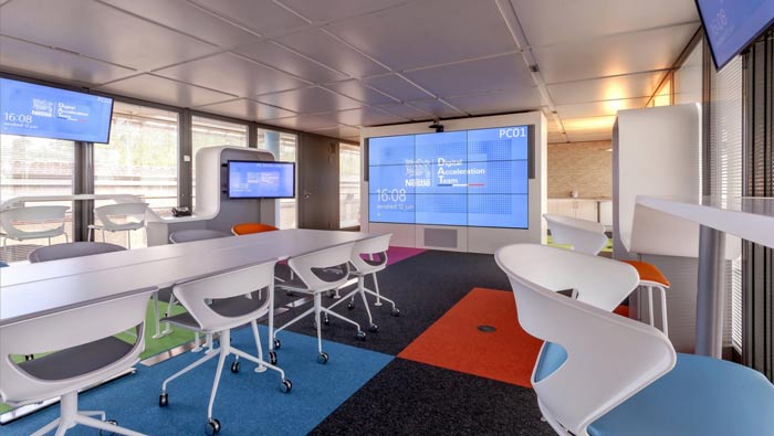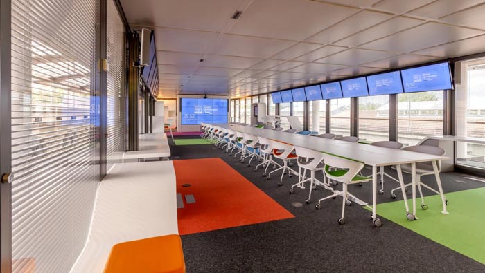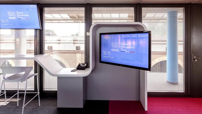 環境監測公司辦公室顯示器設計:辦公空間中的顯示器,可以做到上下左右輕微的移動,而每一個顯示器所對應的都是不同的區域,的目就是讓空間完全沒有死角,讓員工時時刻刻、隨時隨地可以檢測到數據。