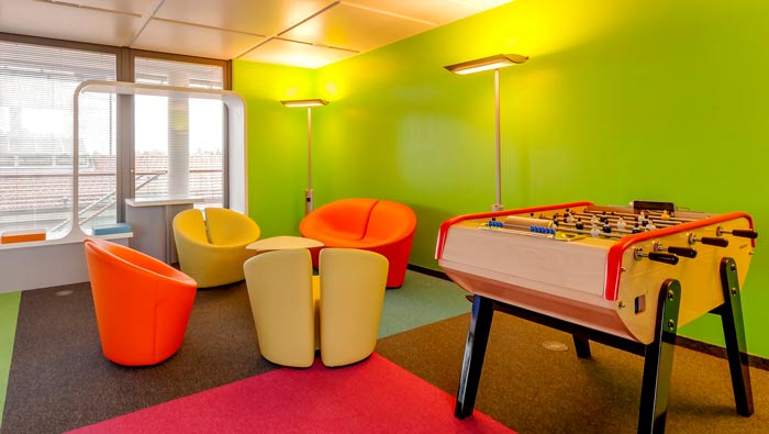 環境監測公司辦公室休息區設計:此處主要是供員工休息、聊天、閱讀之用,當然平時也可以用作洽談,此地的色彩目的就是為了避免空間過于單調,色彩的設計在此處可以有效的緩解疲勞。
