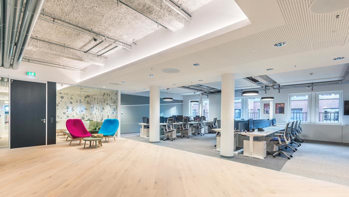 辦公區(qū)域的設(shè)計:因為空間本身有一些柱體存在,且無法去除,在此基礎(chǔ)上設(shè)計師利用色彩、材質(zhì)的不同,以柱體為分割點將空間一分為二,但是在兩個空間之間卻沒有實體的任何材質(zhì),這也是設(shè)計師的高明之處,這樣一方面去除了柱體對于空間的影響,同時空間的通暢性也大大提升。