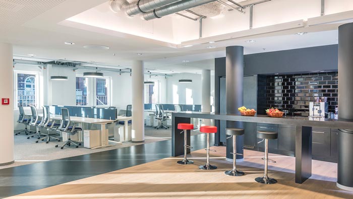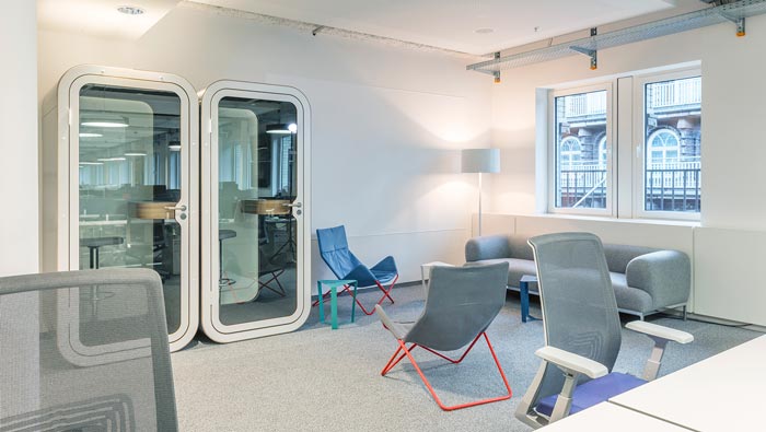 休息區(qū)域的設(shè)計:在休息區(qū)域的設(shè)計中,設(shè)計師并沒有固定一個獨立的空間,而是在辦公區(qū)域的后方留下了一篇活動區(qū)域,在這里最引人矚目的就是兩個長方形的柜體,這樣的柜體主要作用就是封閉的打電話柜,當(dāng)員工有電話的時候可以在這里面進(jìn)行接聽與交流,在保證通話的同時,也不會對外界有任何影響。