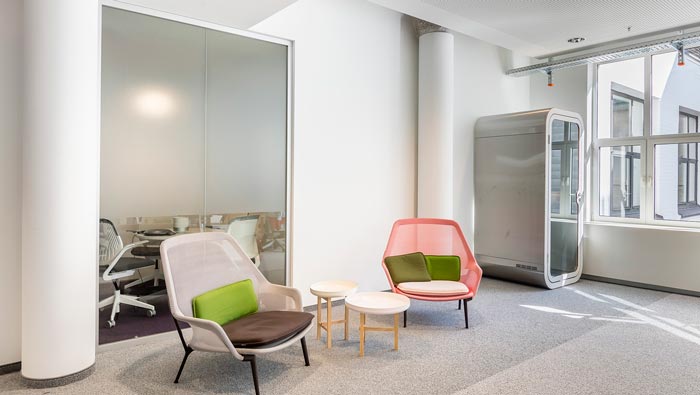 會議室的設(shè)計:企業(yè)的文化就是任何問題都在內(nèi)部解決,所以對于會議室就有很高的要求,此處僅為空間的冰山一角,設(shè)計師利用了一個小小的物件——轱轆,就讓整個空間擁有了活性,空間可以根據(jù)需求自主的形成每一個形狀,一切都是可操作性的,代行會議室只需要將桌子進(jìn)行重組就可以,方便又便捷。