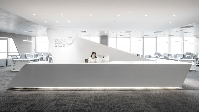 培訓機構辦公室前臺設計:前臺給人的感覺好像從天而降一般,這也是因為整個空間呈開放式分布,設計師為了避免整個空間一覽無余,故此選用造型新穎、別致的前臺,這樣的前臺除了承擔起接待的任務,同時也要承擔阻隔的作用,在山尖處設計師將logo安置在此處,為企業的發展指明了方向。