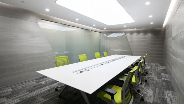 培訓機構辦公室會議室設計:灰色的地毯加上柔柔的燈光,讓整個空間顯得格外輕松,灰色猶如似亮非亮,燈光代表似亮非亮已經成為過去,這表示著事情已經解決,設計師希望通過這樣巧妙的設計,為會議的開展提供一絲助力,讓人、空間、設計可以合為一體。