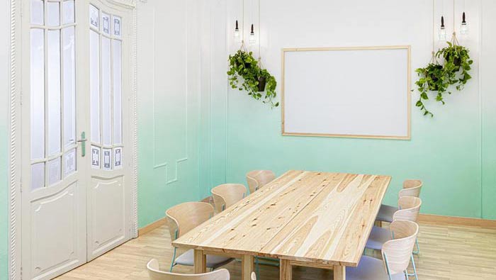 本次英語培訓機構辦公室裝修設計案例講解到此結束,在辦公室設計中,設計師選用溫暖的材質-----松木板,因為松木板能傳達出一種愉快的感覺,設計師希望給客戶、教師帶來不一樣的體驗。